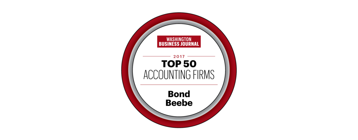 Bond Beebe Accountants and Advisors has been named to the Washington Business Journal’s 2017 Top Accounting Firms List. In such a large and competitive market, Bond Beebe is honored to once again be recognized as one of the top firms in the DC Metropolitan region.